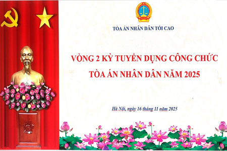 Thực hiện Thông báo số 879/TB-HĐTD ngày 27/8/2025 của Hội đồng tuyển dụng công chức Toà án nhân dân tối cao về việc tuyển dụng công chức Tòa án nhân dân năm 2025, Thông báo số 33/TB-HĐTD ngày 11/11/2025 của Hội đồng tuyển dụng công chức Toà án nhân dân tối cao về danh sách thí sinh tham dự, thời gian, địa điểm, hình thức thi Vòng 2 kỳ thi tuyển dụng công chức Tòa án nhân dân năm 2025 và các văn bản liên quan, sáng ngày 16/11/2025, tại Học viện Tòa án, Tòa án nhân dân tối cao đã tổ chức kỳ thi tuyển dụng công chức vòng 2 năm 2025 theo đúng kế hoạch đề ra.
